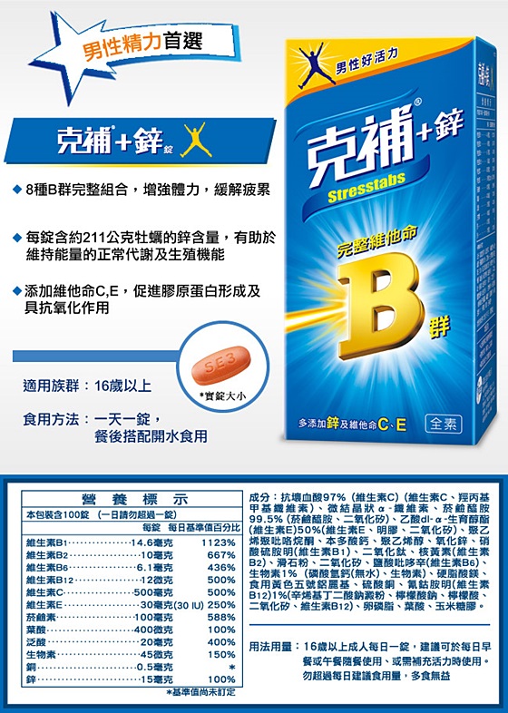 給努力生活男性朋友的【克補】完整維他命B群-鋅錠,每錠特別添加約211公克牡蠣的鋅含量,幫助男性維持生理機能,精力充沛、自信滿分!