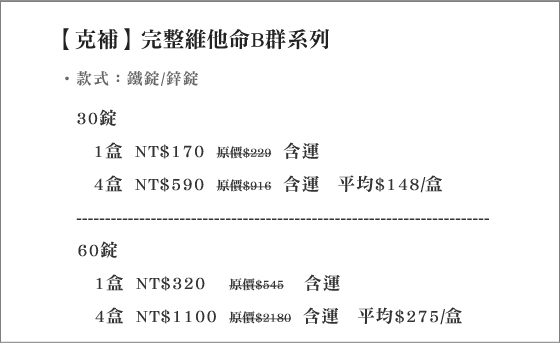 商品訊息簡述: 只要170元起(含運)即可購得【克補】原價最高2180元完整維他命B群系列:(A)鐵錠/(B)鋅錠,規格:30錠/60錠。